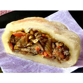 ごぼう、人参をごま油で炒めた風味豊かな「きんぴらごぼう」をたっぷりと包んであります。おやきの弾力ときんぴらの歯ごたえ、さらにピリッとした辛さが後をひく一品。